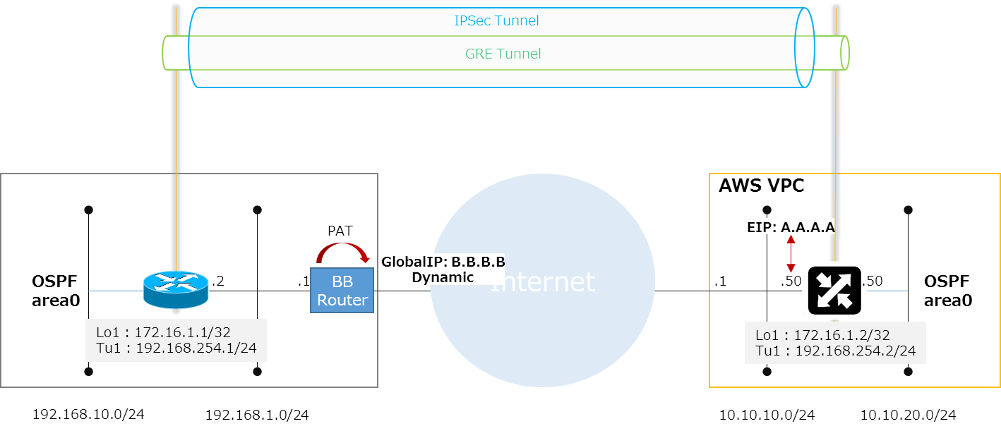 | ■ Vyos 抜粋 set interfaces loopback lo address ‘172.16.1.2/32’ set interfaces tunnel tun1 address ‘192.168.254.2/24’ set interfaces tunnel tun1 encapsulation ‘gre’ set interfaces tunnel tun1 ip ospf dead-interval ’20’ set interfaces tunnel tun1 ip ospf hello-interval ‘5’ set interfaces tunnel tun1 ip ospf priority ‘1’ set interfaces tunnel tun1 ip ospf retransmit-interval ‘5’ set interfaces tunnel tun1 ip ospf transmit-delay ‘1’ set interfaces tunnel tun1 local-ip ‘172.16.1.2’ set interfaces tunnel tun1 mtu ‘1400’ set interfaces tunnel tun1 multicast ‘enable’ set interfaces tunnel tun1 remote-ip ‘172.16.1.1’ set protocols ospf area 0 network ‘192.168.254.0/24’ set protocols ospf area 0 network ‘10.10.20.0/24′ set protocols ospf log-adjacency-changes ‘detail’ set protocols static route 0.0.0.0/0 next-hop 10.10.10.1 distance ‘1’ —- set vpn ipsec esp-group ESP_AWS compression ‘disable’ set vpn ipsec esp-group ESP_AWS lifetime ‘3600’ set vpn ipsec esp-group ESP_AWS mode ‘tunnel’ set vpn ipsec esp-group ESP_AWS pfs ‘enable’ set vpn ipsec esp-group ESP_AWS proposal 1 encryption ‘aes256’ set vpn ipsec esp-group ESP_AWS proposal 1 hash ‘sha256’ set vpn ipsec ike-group IKE_AWS dead-peer-detection action ‘hold’ set vpn ipsec ike-group IKE_AWS dead-peer-detection interval ’30’ set vpn ipsec ike-group IKE_AWS dead-peer-detection timeout ‘120’ set vpn ipsec ike-group IKE_AWS lifetime ‘3600’ set vpn ipsec ike-group IKE_AWS proposal 1 dh-group ’14’ set vpn ipsec ike-group IKE_AWS proposal 1 encryption ‘aes256’ set vpn ipsec ike-group IKE_AWS proposal 1 hash ‘sha256’ set vpn ipsec ipsec-interfaces interface ‘eth0’ set vpn ipsec logging log-modes ‘all’ set vpn ipsec nat-traversal ‘enable’ set vpn ipsec site-to-site peer 0.0.0.0 authentication mode ‘pre-shared-secret’ set vpn ipsec site-to-site peer 0.0.0.0 authentication pre-shared-secret ‘aws’ set vpn ipsec site-to-site peer 0.0.0.0 authentication remote-id ‘192.168.1.2’ set vpn ipsec site-to-site peer 0.0.0.0 connection-type ‘respond’ set vpn ipsec site-to-site peer 0.0.0.0 ike-group ‘IKE_AWS’ set vpn ipsec site-to-site peer 0.0.0.0 local-address ‘10.10.10.50’ set vpn ipsec site-to-site peer 0.0.0.0 tunnel 1 esp-group ‘ESP_AWS’ set vpn ipsec site-to-site peer 0.0.0.0 tunnel 1 local prefix ‘172.16.1.2/32’ set vpn ipsec site-to-site peer 0.0.0.0 tunnel 1 remote prefix ‘172.16.1.1/32’ |